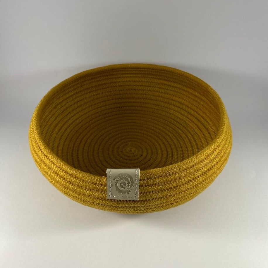 Handmade belly basket crafted from sturdy woven rope, featuring a warm mustard hue — perfect for stylish storage or as a decorative accent.